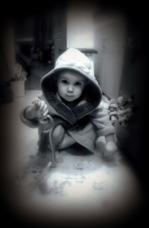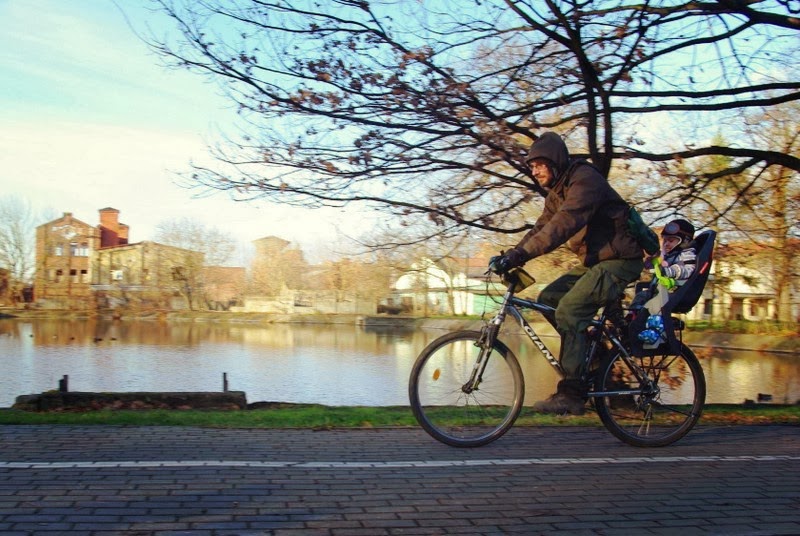 Niestety jeździmy bez kasku, bo wciskanie go na grubą czapkę nie zdaje egzaminu. Jeździmy ostrożnie po mało uczęszczanych uliczkach. Pocieszam się, że tu w Żyrku mało które dziecko jeździ w kasku i jakoś nie ma tragedii (a dzieci w fotelikach jeździ tu sporo). Ale jak tylko zrobi się cieplej, kask wróci do łask. Dla mego spokoju sumienia. Za to doskonale przydają się ochraniacze na stopy od babci i kombinezon przeciwwiatrowy trafiony od kogoś na alledrogo. Tylko nie ma kaptura, ale tu jakoś dajemy radę. Pod spodem Klu ma najczęściej bluzę z kapturem albo wysokim kołnierzem. Problemem są rękawiczki, nie tylko podczas jazdy. Takie zwykłe są mocno przewiewne, muszę poszukać czegoś z ortalionem na wierzchu. Albo czas poświęcić jakiś używany polar tatusia i uszyć dłuższe polarowe. Tradycyjne jakoś nie zdają egzaminu.