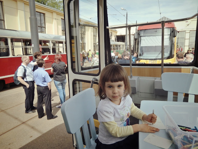 Kluska też świetnie się bawiła, można powiedzieć, była w swoim żywiole, bo uwielbia komunikację miejską pod każdą postacią. Tu miała okazję zwiedzić "ogórki", przejechać paradą przez pół miasta i obejrzeć zamkniętą zazwyczaj dla szarego człowieka zajezdnię tramwajową przy Kawęczyńskiej. Kiedyś zwiedzaliśmy ją ze znajomymi, dostanie się tam w zwykłym trybie wymagała multum zezwoleń, przewodnika i cud, że w ogóle pozwolili robić nam zdjęcia. Tego dnia zajezdnia otwarła swe podwoje dla miłośników wycofanego taboru. Super pomysł - umieszczenie stołu do rysowania dla dzieci w jednym z tramwajów. Macie ode mnie wielkiego plusa!