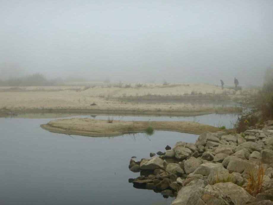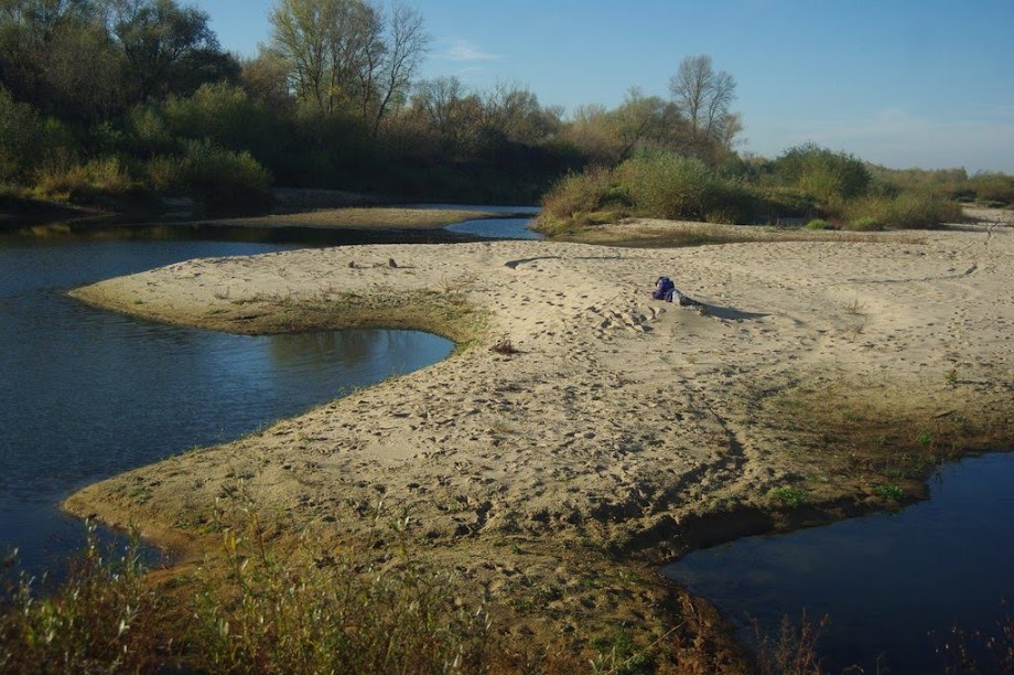 W naszej okolicy płynie sobie rzeka Rawka, gdzie czasem na zakrętach są dzikie plaże. Jedna z takich plaż, uwielbiana przez kajakarzy, ale i innych mieszkańców, latem jest tłumnie odwiedzana. Dlatego wybraliśmy się jesienią, żeby mieć odrobinę prywatności. A i tak było dużo ludzi, bo byliśmy w weekend.