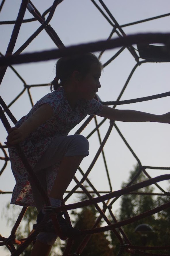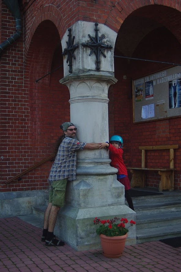W końcu się wybraliśmy na dłuższą wyrypkę, trasa przez skansen i punkt widokowy w Granicy, ale też wcześniej przez plac zabaw w Kaskach. Pierwszy dzień okazał się jednak trochę długi i ostatnie 10km (w sumie przejechaliśmy pierwszego dnia ponad 70) jechaliśmy po ciemku i trochę Klusce się nudziło, więc śpiewaliśmy piosenki. ;)Klusce skansen nie przypadł specjalnie do gustu, zdecydowanie wolała coś zbudować w lesie, a w Kampinosie nie wolno szałasów, to była niepocieszona. No trochę jej poprawił humor punkt widokowy i kalkulator. Dobrze czytacie, kalkulator. ;)