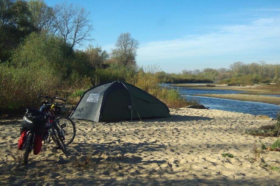 Okazało się, że przyjemna aura prognozowa objawiła się szybko, więc pojechaliśmy nad Wisłę drugi raz, ale krótszą trasą, żeby rozbijać namiot przed zmrokiem i móc na spokojnie rozpalić ognisko, nazbierać drewna i tak dalej.