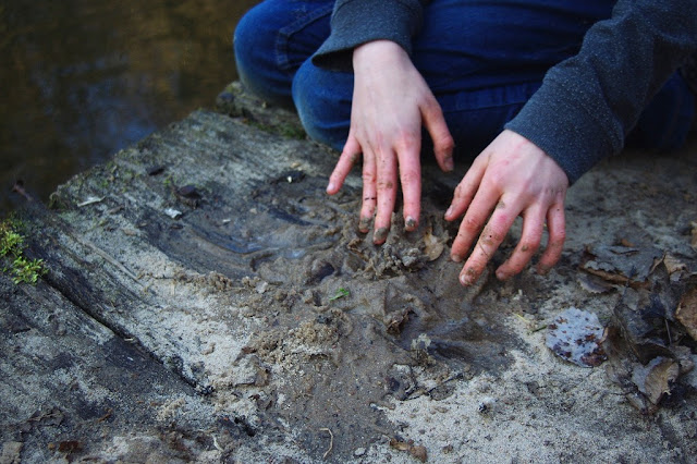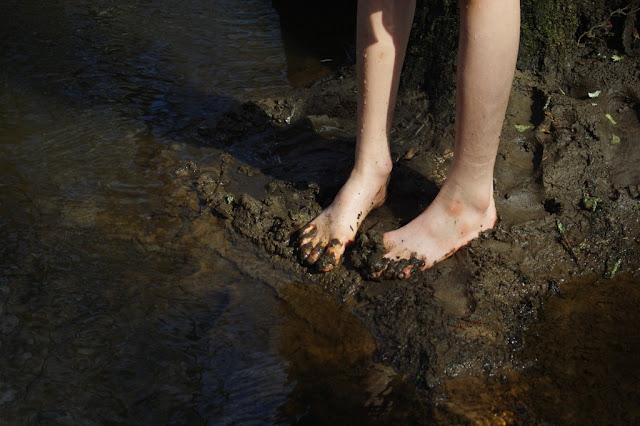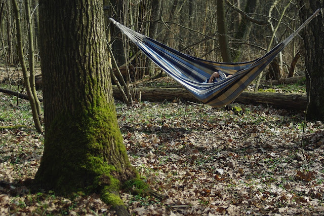 Kluska korzysta z okazji wiosennej kąpieli i innych ćwiczeń sensorycznych w błotku.Hamak oczywiście jest grany.