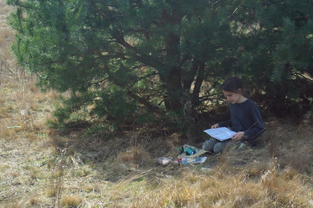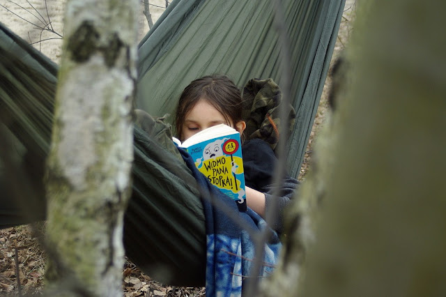 Podczas chłodniejszy dni nawiedzaliśmy pobliski "park leśny", czyli po prostu sosnowy lasek samosiejek, które otoczyło miasto rozrastając się. Kilka lat temu miasto zrobiło tu plac zabaw dla dzieci, ale starszaki jak Kluska wolą łazić po iglastych młodnikach.Kluska założyła mikrofarmę mrówek, gdzie obserwowała ich poczynania ładnych parę godzin. Nawet nakręciłyśmy wspólnie film przyrodniczy. LINKW wolnej chwili okryta kocykiem Kluska czyta kolejną nie-lekturę. Całe szczęście, że teraz dzieciaki mają mnóstwo możliwości czytania tego, na co mają ochotę. Ostatnimi laty powstało mnóstwo fajnych serii, które się czyta nawet w jeden dzień.Jeździmy też do naszej tajnej bazy na polach, którą odkryliśmy podczas narodowego zamknięcia lasów rok wcześniej. ;)