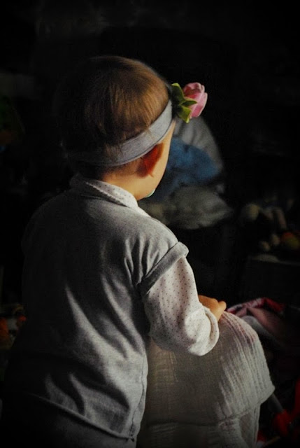 Z innych przyjemności, coraz trudniej mi robić fotki Klusce. Na spacery najczęściej chodzi z nią tata, zapomina aparatu, a jak nie zapomni to i tak nie ma którą ręką robić zdjęć. Babcie i wujkowie robią zdjęcia komórkami, co przy ruchliwości małej oznacza 3/4 rozmazanych a resztę nieostrych. Nawet ze swoim lepszym aparatem mam problem, bo niestety obiektyw mam do landszaftów, a nie zdjęć studyjnych bez wspomagania sztucznym oświetleniem. Więc wrzucam to, co mi się jako tako udało podratować. A wyłazić na dwór z małą tylko po to, by zrobić jej kilka zdjęć, nie bardzo mi się chce. Bo to i czas, kiedy trzeba ją przebierać. W domu chłodno, kaloryfery wyłączone, ale grzeją nas sąsiedzi i nadal jest za ciepło, by ją w domu trzymać w dresie.