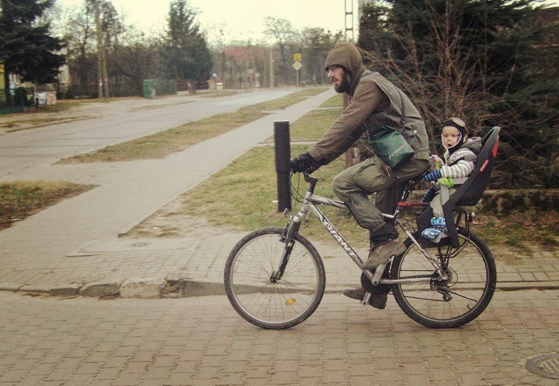 Ale i tak pojechaliśmy, wiatru nie było, akurat myknąć pod las i z powrotem. Ledwo siedem kilometrów z hakiem. Mamy taki system, że najpierw szykuje się z rowerem tata Kluski, ja wynoszę ją ubraną przed klatkę i wpinamy ją w rower. Potem oni sobie kołują wokół bloku, a ja pakuję na wszelki wypadek koce (gdyby zasnęła) i inne drobiazgi które przyjdą mi do głowy, sprawdzam czy nic nie zostało na gazie, zamykam mieszkanie i znoszę rower na dół. Zazwyczaj w tym czasie przejeżdżają około jednego kilometra.