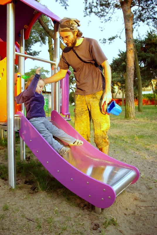 U celu. Plac zabaw w Grodzisku Mazowieckim zawstydzi niejeden plac w Warszawie. W życiu nie widziałam placu na tak dużym obszarze, tak zagospodarowanego. Obszarem dorównuje mu tylko ten w Ursusie przy torach, ale nie wyposażeniem. Znam naprawdę dużo warszawskich placów zabaw, zwiedzałam je jeszcze na długo przed pojawieniem się Kluski na świecie, po prostu je lubię. Ogromna okrągła piaskownica z domkiem i stolikami do zabawy piaskiem oraz rurą-tunelem. Parę oddzielnych domków-zjeżdżalni dla dzieci 0-3 lat i kolejne dwa dla starszych. Wreszcie duża sieć i jeszcze parę ścianek dla bardzo dużych dzieci plus cała masa innych bajerów, np. mini-karuzelki miseczki. Co najważniejsze, jest tu TOALETA KONTENEROWA. Oddzielna dla kobiet i niepełnosprawnych oraz dla mężczyzn. Nie wiem dlaczego niepełnosprawnych wrzuca się do kobiet, przecież osobami na wózkach inwalidzkich częściej są mężczyźni, ale tak już jest, mówi się trudno. Tak zwana furtka w prawie, by nie robić trzech oddzielnych toalet (tłumaczę, gdybyście się też nad tym zastanawiali).