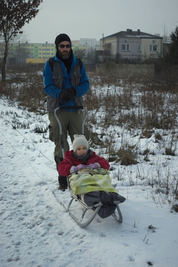 Po ulepieniu bałwanka Kluska zaczęła bawić się łopatką i szukać wody. Buty przemoczone na fest, a my jeszcze innego dnia poszliśmy zjeżdżać sankami z górki. No i teraz mamy katar. Mam nadzieję, że się rozejdzie po kościach. Jakiś kataralno-pokasłujący bakcyl łazi po nas od jakiegoś czasu. Ale chyba nie jest bardzo groźny. W każdym razie w zeszłym roku o tej porze mieliśmy już parę wizyt u lekarza zaliczonych, a tej zimy jakoś lepiej, bo póki co żadnej.