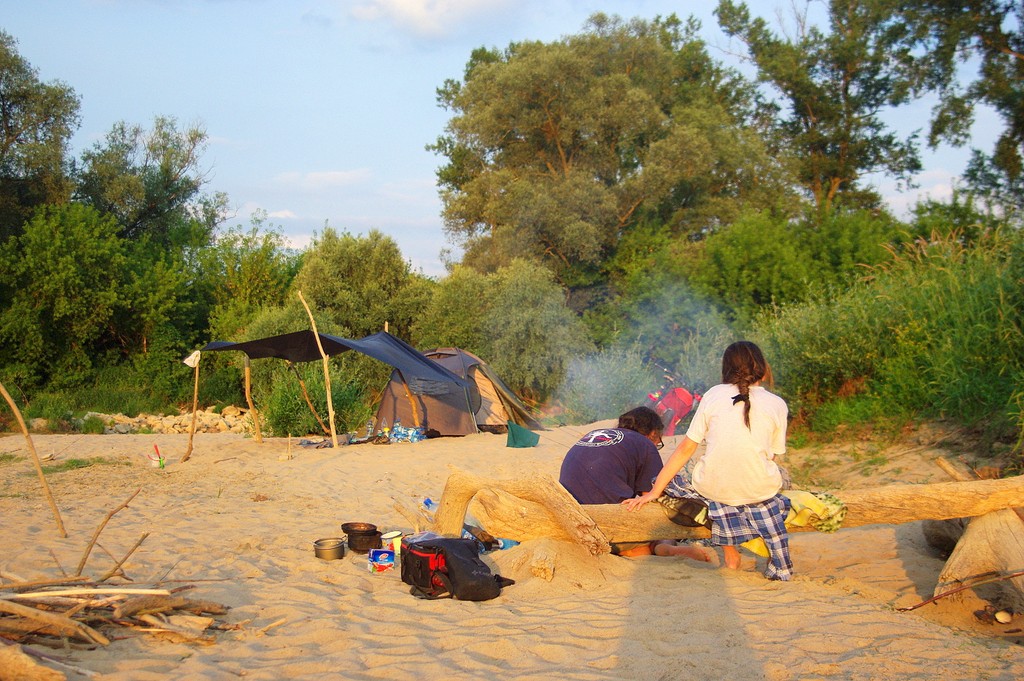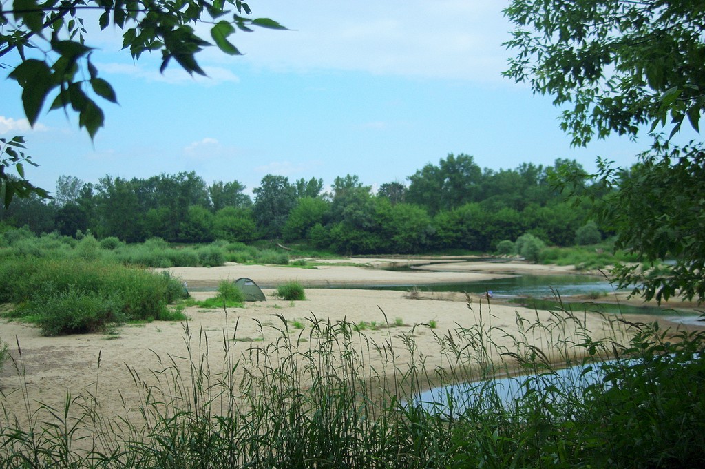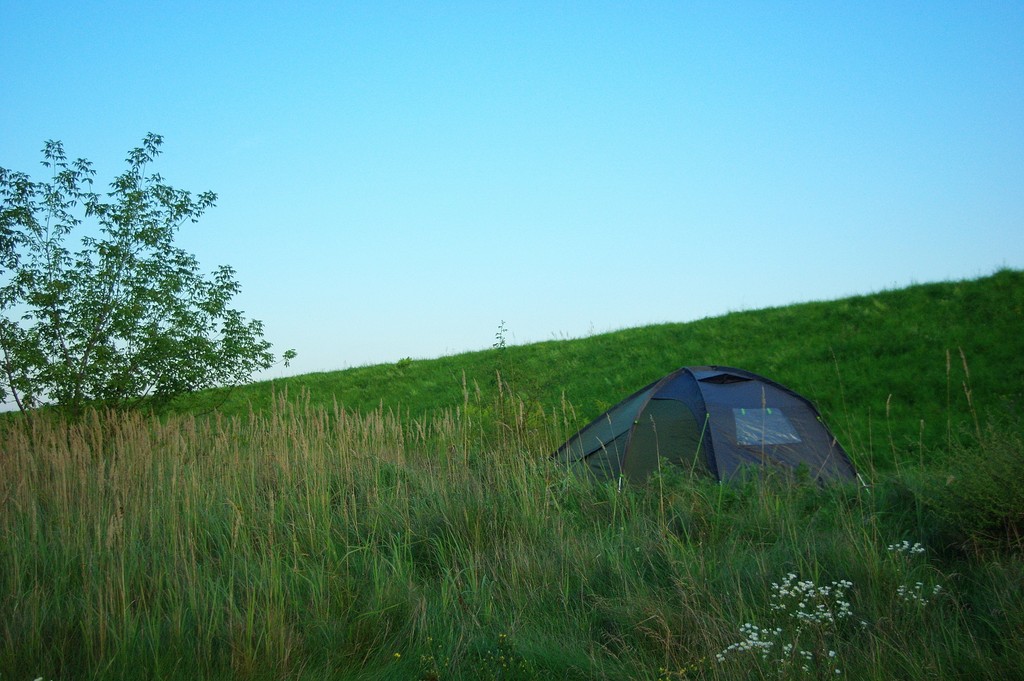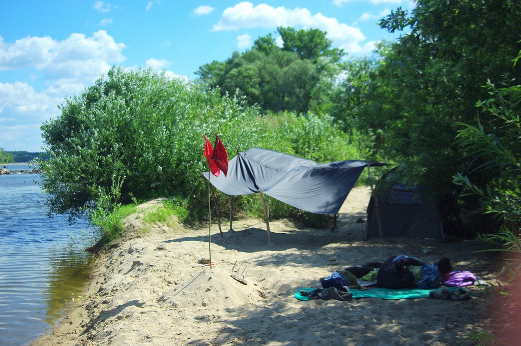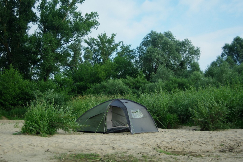 Trzymam roczne opóźnienie we wpisach na blogu, niebywałe, jakiego lenia dostałam. To było jedno z bardziej namiotowych lat, skorzystaliśmy z nieco chłodniejszej niż zwykle aury. Było paskudnie gorąco, ale dało się wytrzymać w pochmurny dzień na dworze. Dlatego postanowiliśmy się wybrać namiotowo na naszą znajomą plażę korzystając z niskiego poziomu rzeki o tej porze roku. Niestety strasznie nas nękały komary, a w dzień trzeba się było jednak trzymać cienia. Przydał się tarp, właśnie czarny, bo dawał porządny cień, a wiało od spodu i jakoś do wieczora zeszło. Kluska i Tomi się schładzali w rzece, mnie nie za bardzo (woda za zimna ojejku!),a ja sobie tylko zamoczyłam nogi, a tak to siedziałam i pilnowałam, czy dziecko się nie topi.
