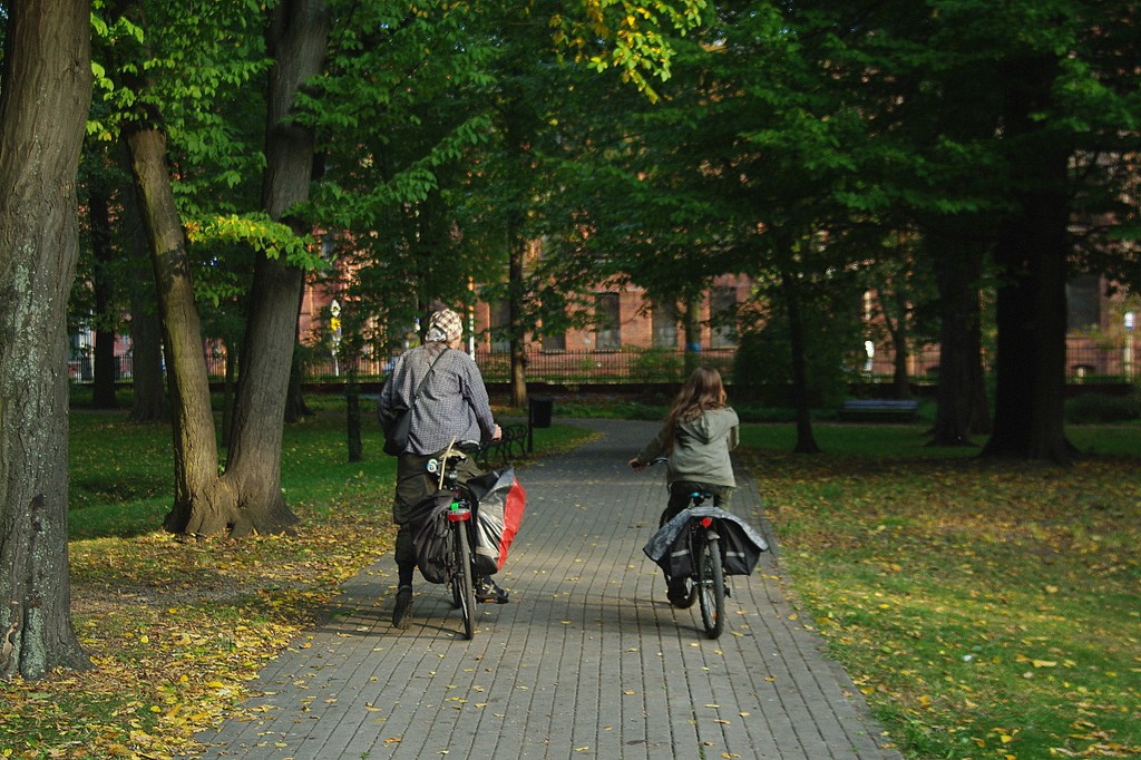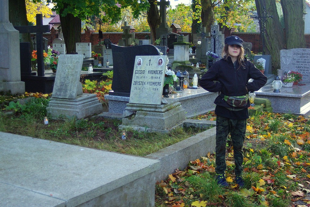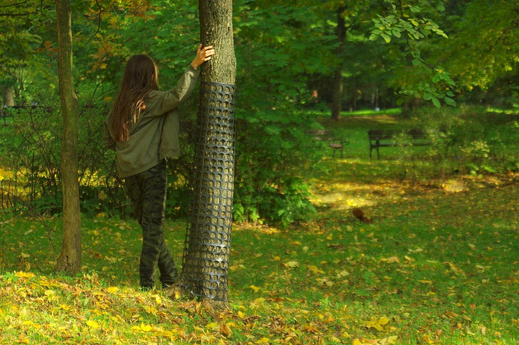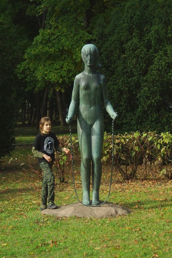 I w ogóle łazimy gdzie bądź z resztą spacerowiczów. ;)Stajemy też na chwilkę przy mogile.I wjeżdżamy przez dziurę w płocie na teren AWF, by zrobić sobie fotkę z kultową dziewczynką ze skakanką.W ogóle w tym roku jakoś tak bardziej parkowo nas nosi, a nie dziko. Rok życia jak partyzant może się znudzić. Dlatego korzystamy z uroków miasta, póki znów nie zdelegalizują powietrza. Żyrardów zaczyna się barwić na żółto. Dziwne osłonki to ochrona przed bobrami.