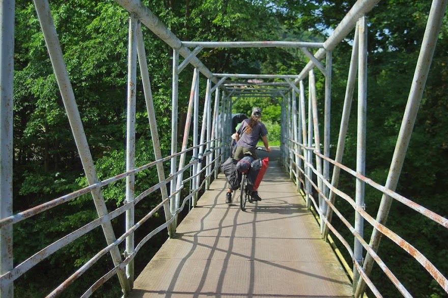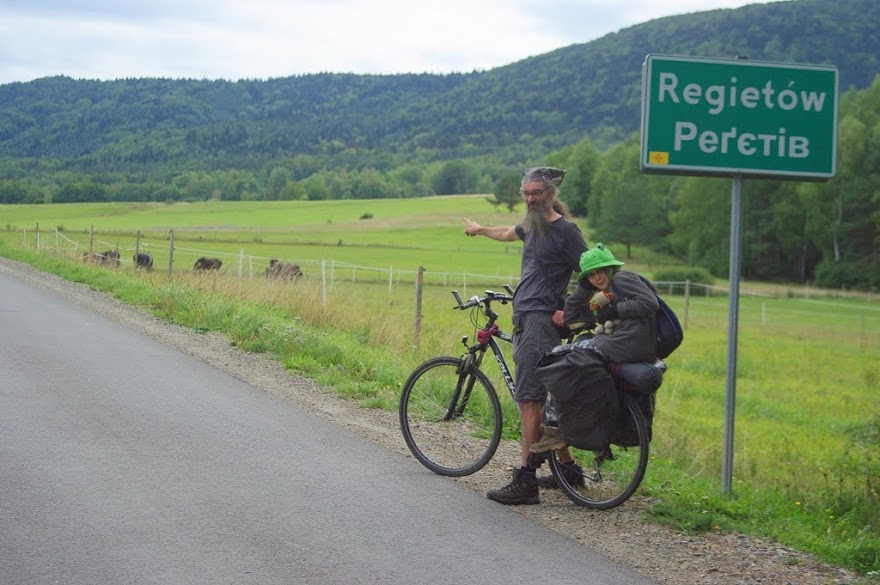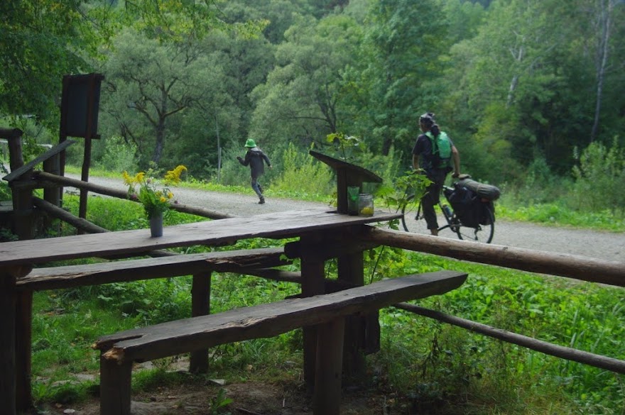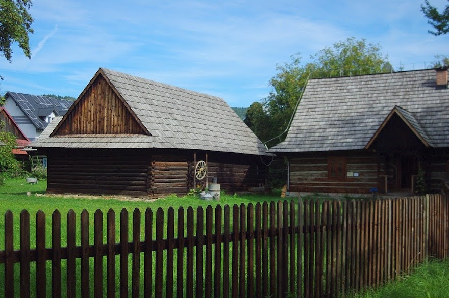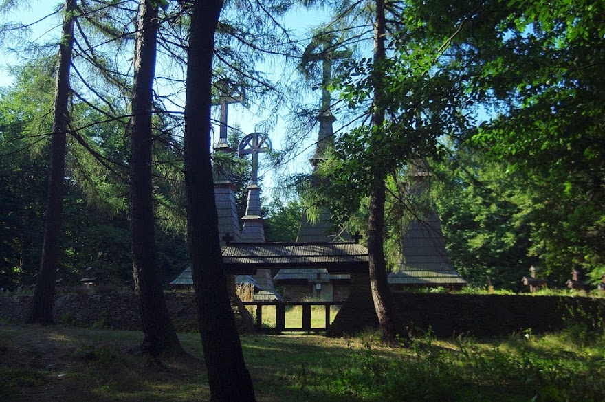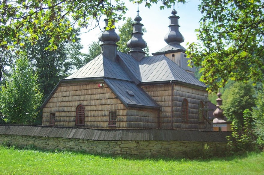 Trasa kolejowo-rowerowa niemal ta sama, tym razem jednak ominęliśmy zjazd do zapory i plażę nad Klimówką i zamiast tego podjechaliśmy do skansenu Zagroda Maziarska w miejscowości Łosie. Mamy pewne wątpliwości co do odmiany jej nazwy przez przypadki, więc zapisuję w formie głównej. Zagroda znajduje się nad rzeką Ropą, niedaleko mostku i drewnianej cerkwi, która była otwarta, więc zwiedziliśmy i ją. Nad samą Ropą, tylko wcześniej, w innym miejscu, zrobiliśmy sobie postój na żarcie i wybieganie Kluski.