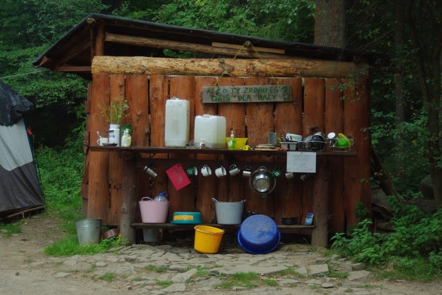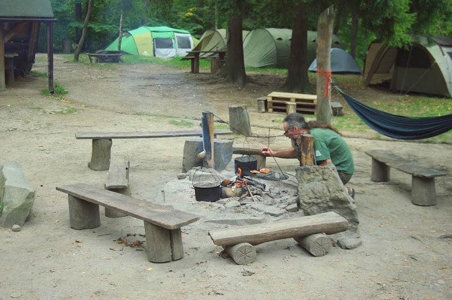 Pogodę mieliśmy świetną niemal cały czas, dopiero ostatnie dwa dni zaczęło padać, więc z ogniska nici, przenieśliśmy się pod wiatkę i z nudów zaczęliśmy gotować i piec ciasta. Pierwszy raz zrobiliśmy ciasto drożdżowe. Zakalec nawet nie był duży, a miny częstowanych tym ciastem turystów były bezcenne. Ten piecyk na drewno z piekarnikiem jest naprawdę mega!